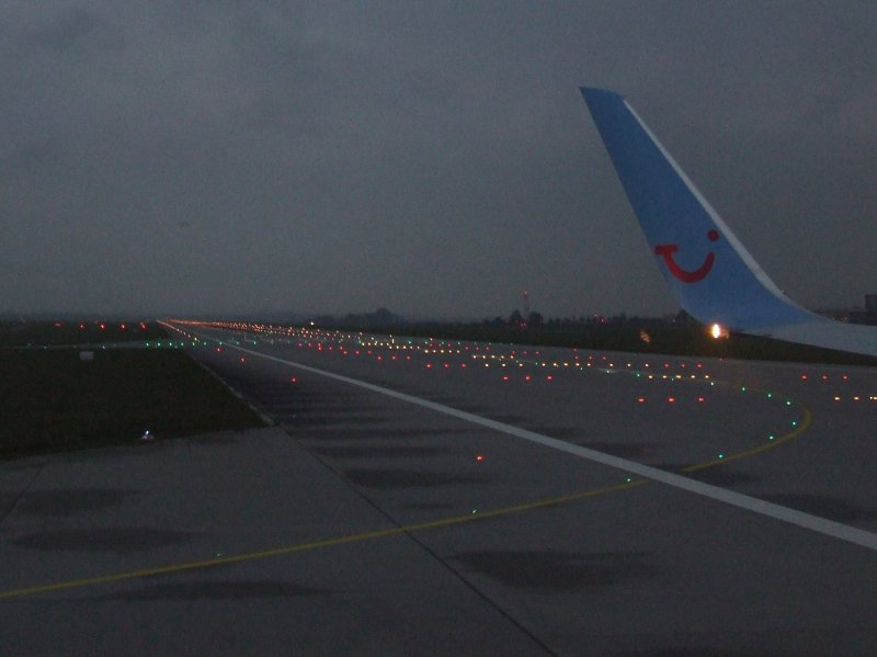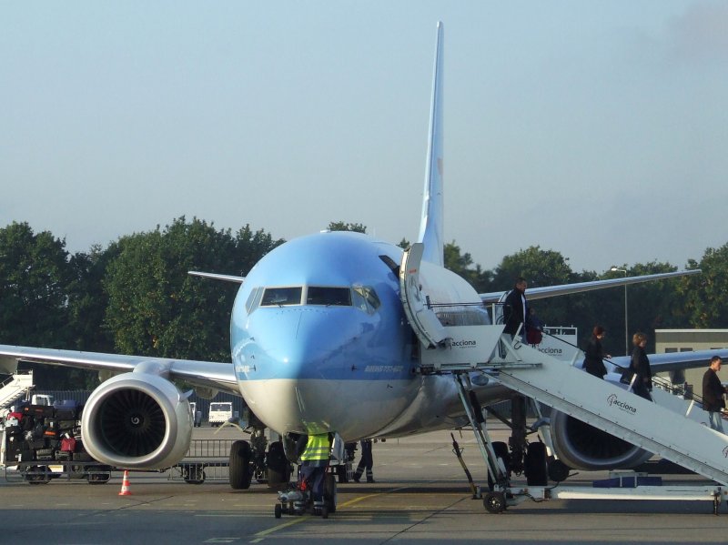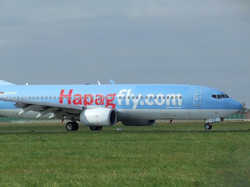 Nach der Landung in Stuttgart auf dem Rollfeld: Eine Hapagfly Boeing 737-800. (20.09.2008)