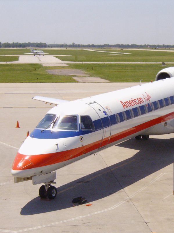 Ein Embraer RJ-145 der American Eagle auf dem Rollfeld des Wichita Mid-Continent Airport (ICT), Kansas, USA am 09.06.2006.