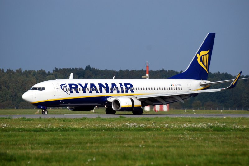 Eine Boeing 737-800 der Ryanair nach der Landung auf dem Flughafen Lübeck Blankensee am 27.09.08