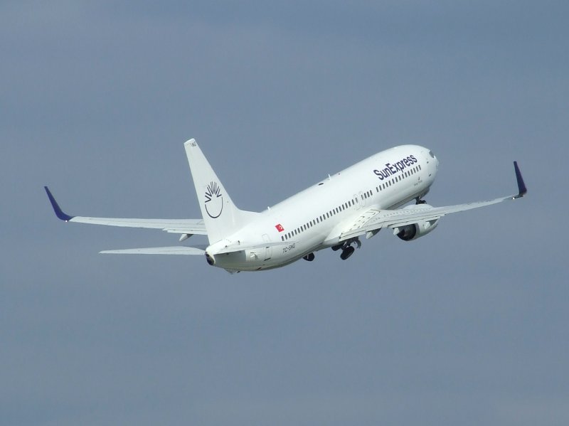 Eine Boeing 737-800 der türkischen SunExpress beim Einfahren der Fahrwerke kurz nach dem Start in Stuttgart (STR) am 20.09.2008.