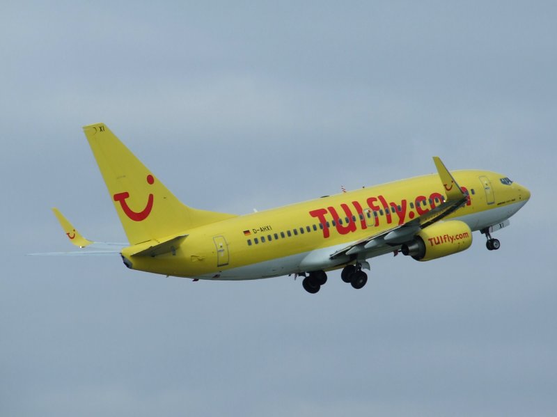 Eine TUIfly Boeing 737-700 schwebt am 20.09.2008 dem trüben Mittagshimmel kurz nach dem Start in Stutttgart entgegen.