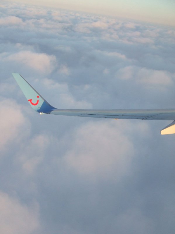 Kurvenflug im Morgenrot in einer Boeing 737-800 der Hapagfly auf dem Weg nach Berlin-Tegel am 25.09.2008.
