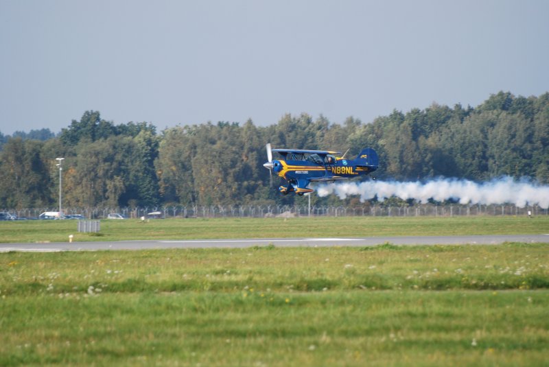 Mit Vollgas und Smoke jagt diese Pitts über die Start und Landebahn des Flughafens Lübeck Blankensee bei den Flugtagen Lübeck am 27.09.08
