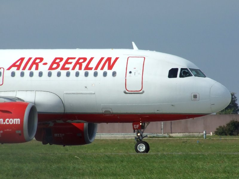 Nahaufnahme eines Airbus A 319 der AirBerlin, kurz nach der Landung in Stuttgart am 20.09.2008.