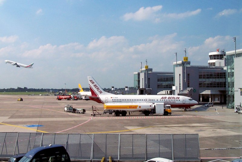 Vorfeld Düsseldorf mit Air Berlin Boeing 737-400 beim Tanken - 06.09.2005