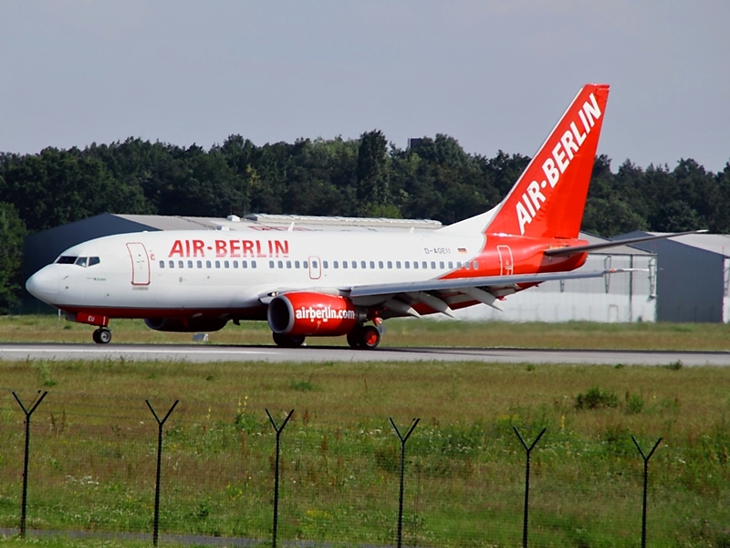D-AGEU, eine 737-700 von Germania ist an Air Berlin verleast. Hier ist am 3.7.2009 in Dresden gelandet.