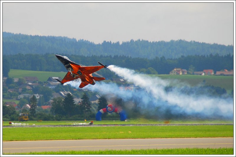 Die F 16 „Fighting Falcon“ (gebaut von General Dynamics, heute Lockheed Martin) der niederländischen Luftstreitkräfte, in ihrer auffälligen Bemalung war sicherlich der erste Höhepunkt am ersten Tag der Airpower 2009. Die Aufnahme zeigt sie am 26.6.2009 beim Start in Zeltweg zu ihrem Solodisplay.
