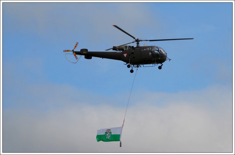 Die von Sud-Aviation gebaute Alouette III - SA-316B des österr. Bundesheer bei der Eröffnung der Airpower 2009 mit der steirischen Landesfahne am 26.6.2009 in Zeltweg.