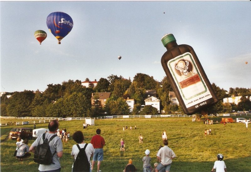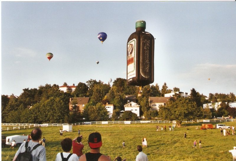 Juni 2002: Hessentag in Idstein. Einer der Programmpunkte war ein Massenstart von Heissluftballons. Mit dabei auch die Jägermeisterflasche, die eben abgehoben hat