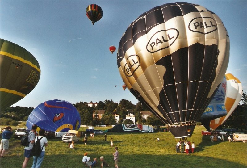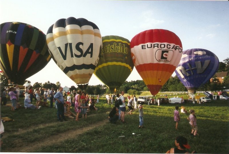 Juni 2002: Hessentag in Idstein. Einer der Programmpunkte war ein Massenstart von Heissluftballons. Hier sind gleich 5 Ballons zu sehen, die kurz vor dem Abheben stehen
