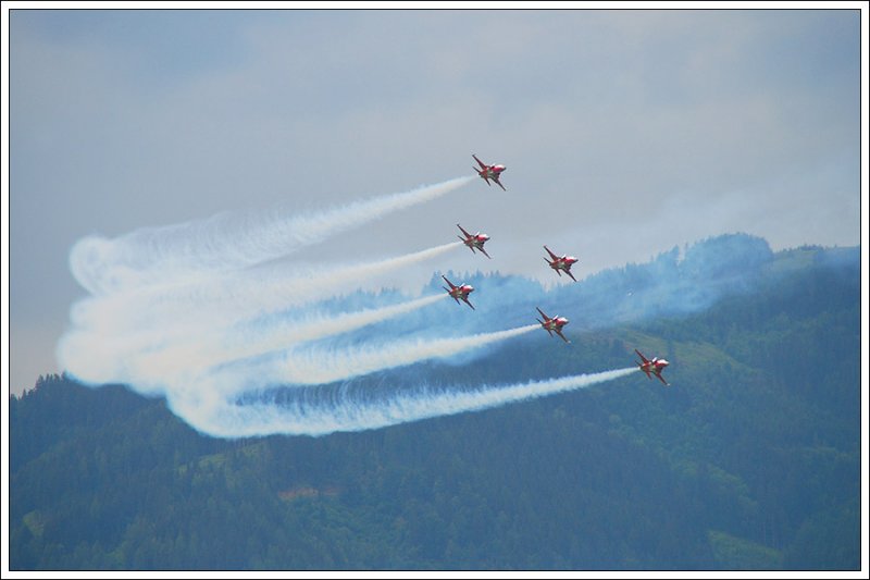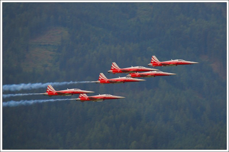 Formationsflug der Patrouille Suisse, hier mit der Hawker Hunter im Verband, mit der 1959 alles angefangen hat. 1994 wurden die Hunter durch die F-5E Tiger II abgelöst. Zeltweg am 26.6.2009.