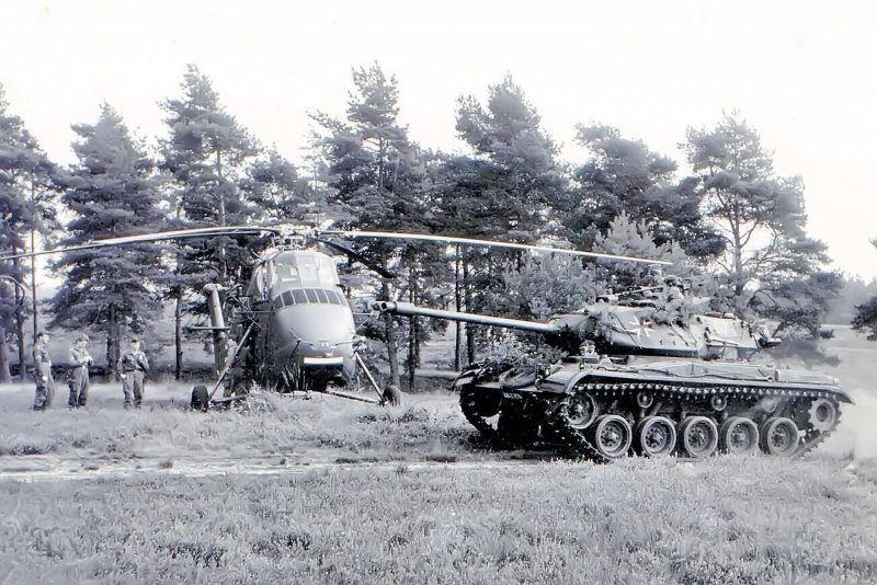 Sikorsky H 34 G-III vom HFlgBtl 6 bei einem "Tag der offenen Tür", 1964, im Vordergrund vorbeirollender Panzer M 41.