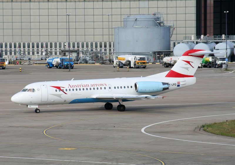 Austrian Arrows Fokker 70 OE-LFG bei der Ankunft auf dem Flughafen Berlin-Tegel am 26.07.2009
