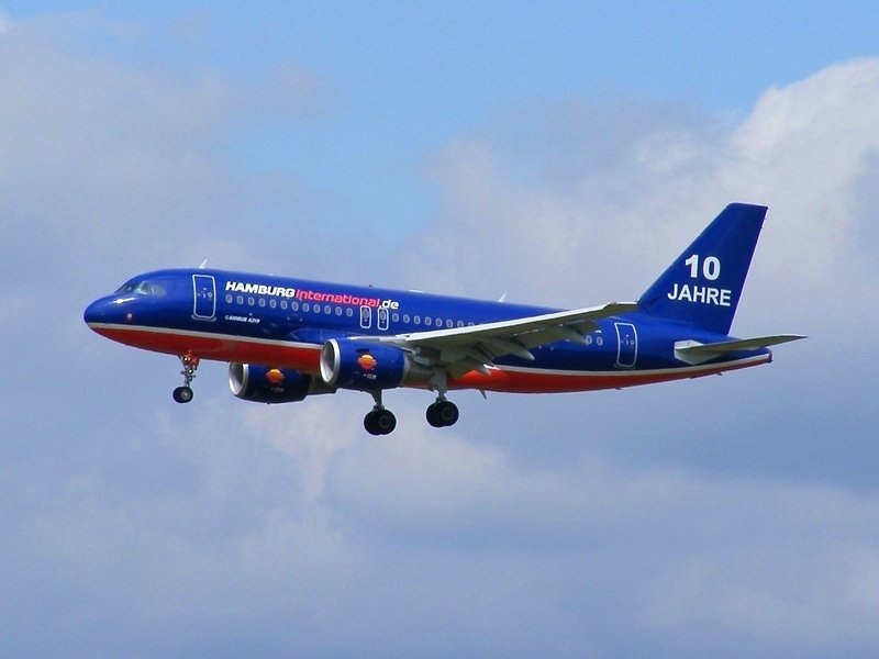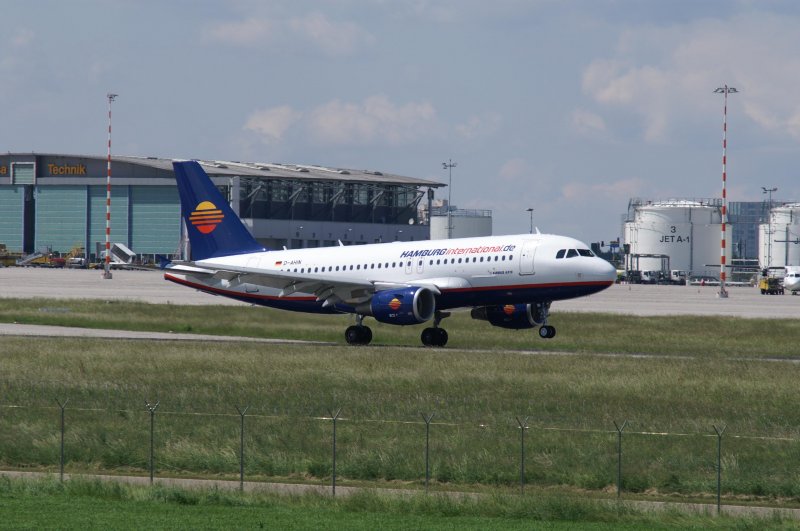Ein Airbus A-319-112 der Hamburg International Airlines mit der Kennung D-AHIN aufgenommen am 30.05.09 am Stuttgarter Flughafen.