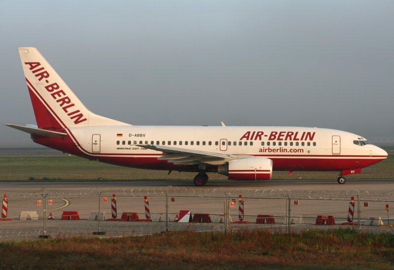 Air Berlin B 737-7Q8 D-ABBV am 27.09.2008 im morgentlichen Nebel auf dem Flughafen Berlin-Tegel