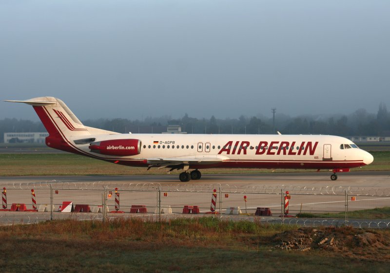 Air Berlin Fokker 100 D-AGPB am 27.09.2008 im morgentlichen Nebel auf dem Flughafen Berlin-Tegel
