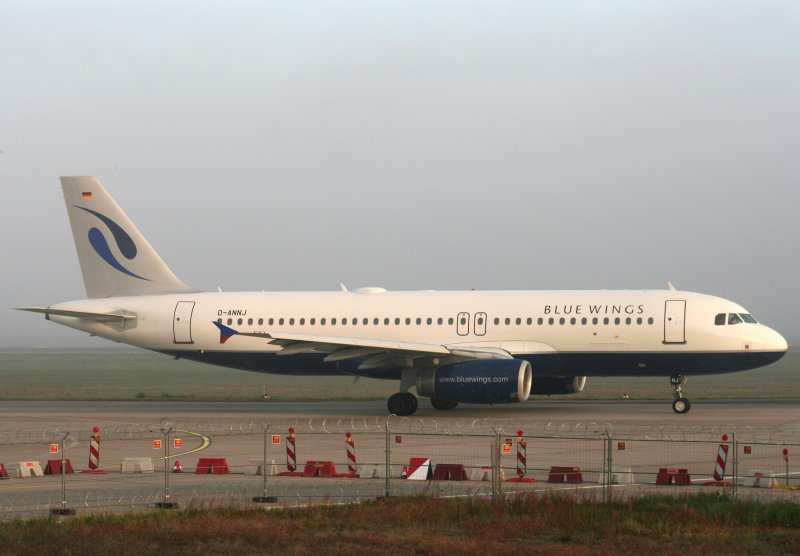 Blue Wings A 320-232 D-ANNJ im morgentlichen Nebel auf dem Flughafen Berlin-Tegel am 27.09.2008