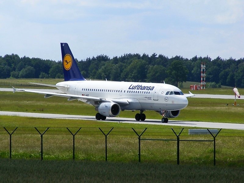 Die "Straubing" (D-AILT, A319-100) von Lufthansa rollt am 7.6.2009 zur Runway in Dresden. Ziel von Flug LH 1057 ist Frankfurt. Grade noch rechtzeitig hatte sich die Fotowolke verzogen.
