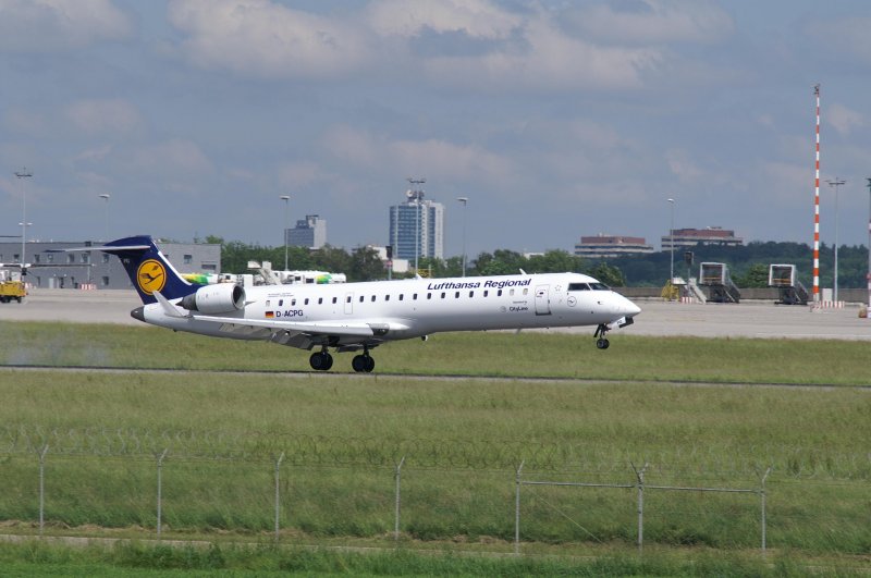Ein Bombardier Inc CL-600-2C10 CRJ-701 der Lufthansa CityLine mit der Kennung D-ACPG aufgenommen am 30.05.09 am Stuttgarter Flughafen.