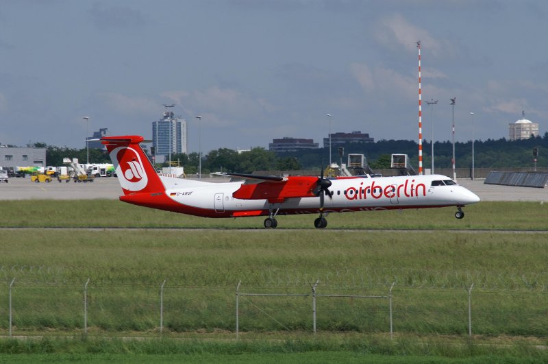 Eine De Havilland Canada DHC 8 der AIR BERLIN mit der Kennung D-ABQF aufgenommen am 30.05.09 am Flughafen Stuttgart.