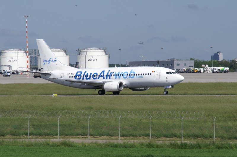 Eine Boeing 737-33A der Blue Air mit der Kennung YR-BAA aufgenommen am 30.05.09 am Stuttgarter Flughafen.