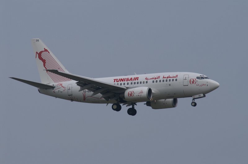 Eine Boeing 737-6H3 der Tunisair (mit 60 Jahre Sonderlackierung) mit der Kennung TS-IOQ aufgenommen am 04.04.09 am Züricher Flughafen.
