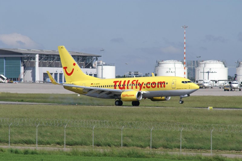 Eine Boeing 737-7K5 von TUIfly mit der Kennung D-AHXC aufgenommen am 30.05.09 am Stuttgarter Flughafen.