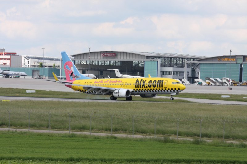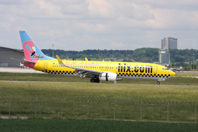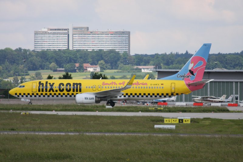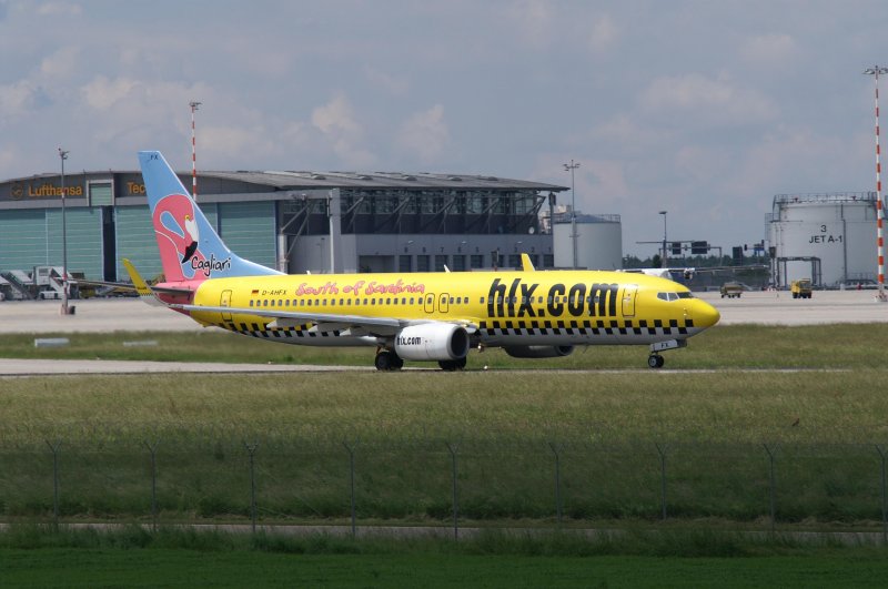 Eine Boeing 737-8K5/W der Hapag-Lloyd Express mit der Kennung D-AHFX aufgenommen am 30.05.09 am Stuttgarter Flughafen.