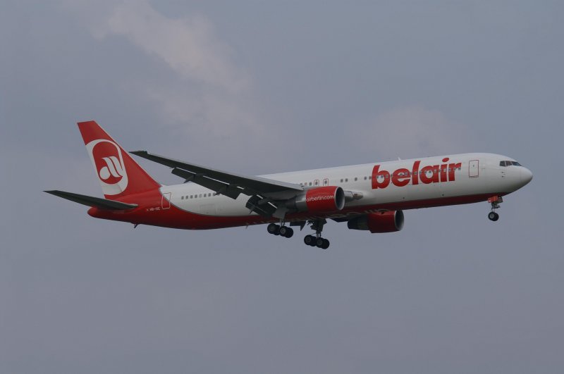 Eine Boeing 767-3Q8ER von Belair mit der Kennung HB-ISE aufgenommen am 04.04.09 am Züricher Flughafen.