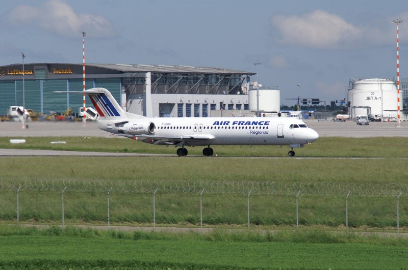 Eine Fokker 100 der Air France mit der Kennung F-GIOG aufgenommen am 30.05.09 am Stuttgarter Flughafen.