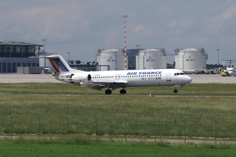 Eine Fokker 100 (F28-0100) der Air France by Brit' Air mit der Kennung F-GKHE aufgenommen am 30.05.09 am Stuttgarter Flughafen.