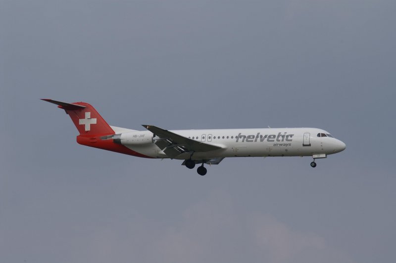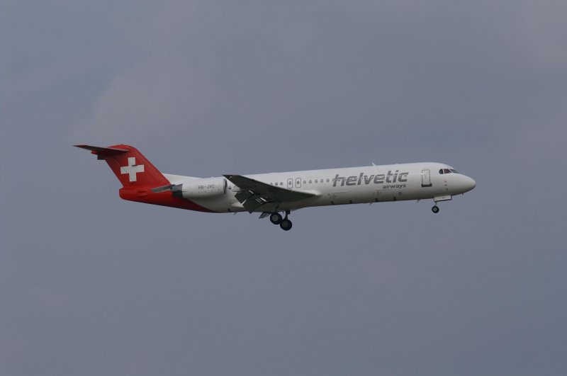 Eine Helvetic Fokker 100 (F28-0100) mit der Kennung HB-JVF aufgenommen am 04.04.09 am Züricher Flughafen.