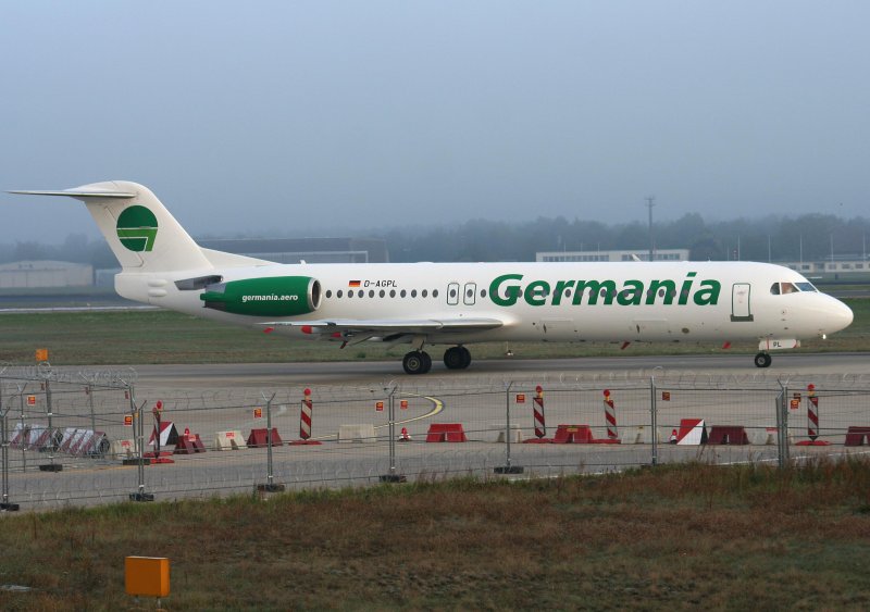 Germania Fokker 100 D-AGPL im morgentlichen Nebel auf dem Flughafen Berlin-Tegel am 27.09.2008