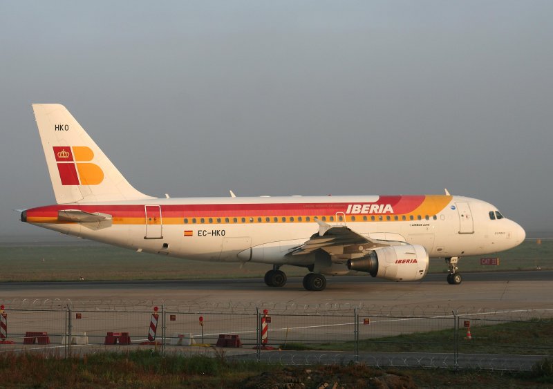 Iberia A 319-111 EC-HKO im morgentlichen Nebel auf dem Flughafen Berlin-Tegel am 27.09.2008