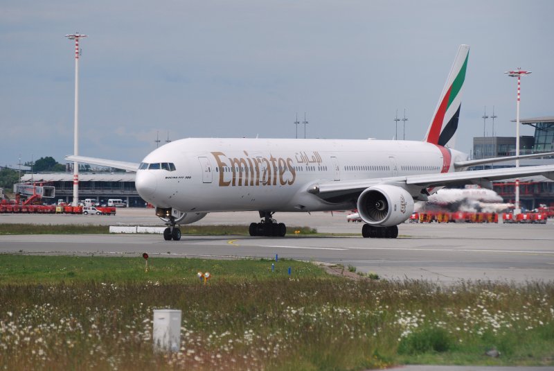 Kurz vor dem Start in Hamburg Fuhlsbüttel die Boeing 777-300 A6-EMR der Emirates am 06.06.09