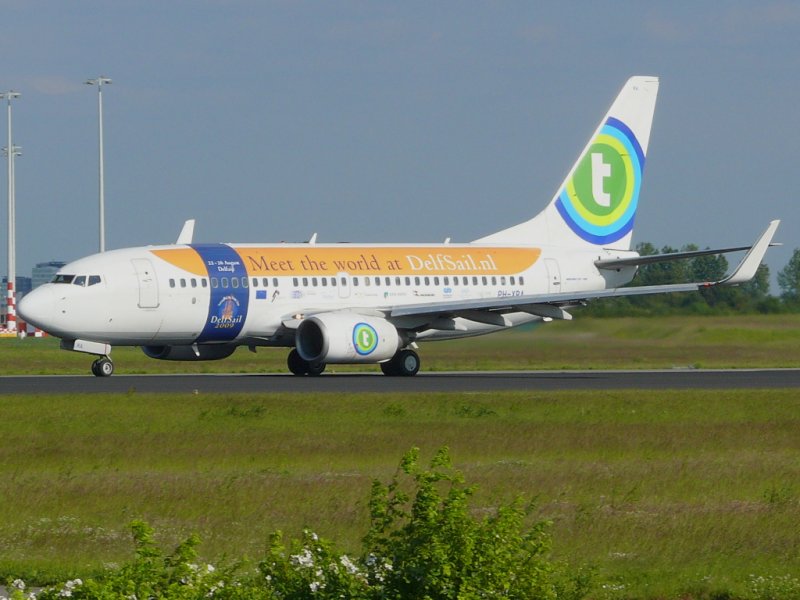 PH-XRA von Transavia mit neuer Sonderbemalung "Delfsail 2009" in Amsterdam 31.5.2009 und habe sie noch am 1.5.2009 mit T-Mobile Farben fotografiert