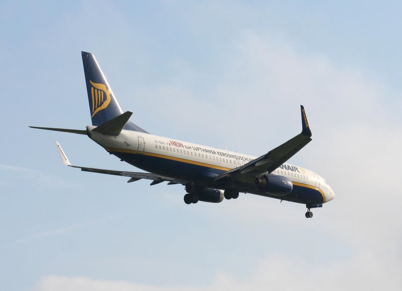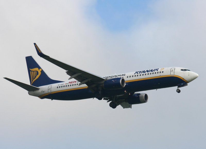 Weitere Ansicht der Ryanair B 737-8AS EI-DAD mit Sonderbemalung " Nein zum Lufthansa Kerosinzuschlag" im Landeanflug auf den Flughafen Berlin-Schönefeld am 31.05.2009.