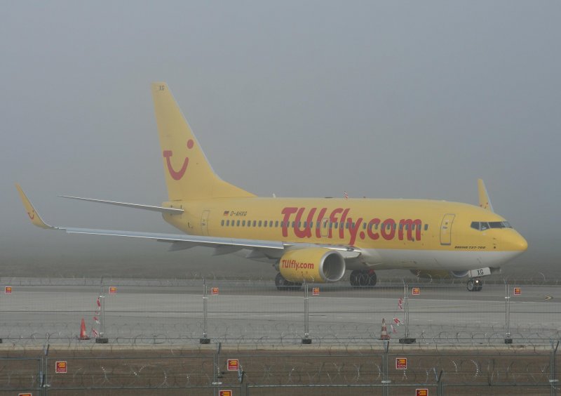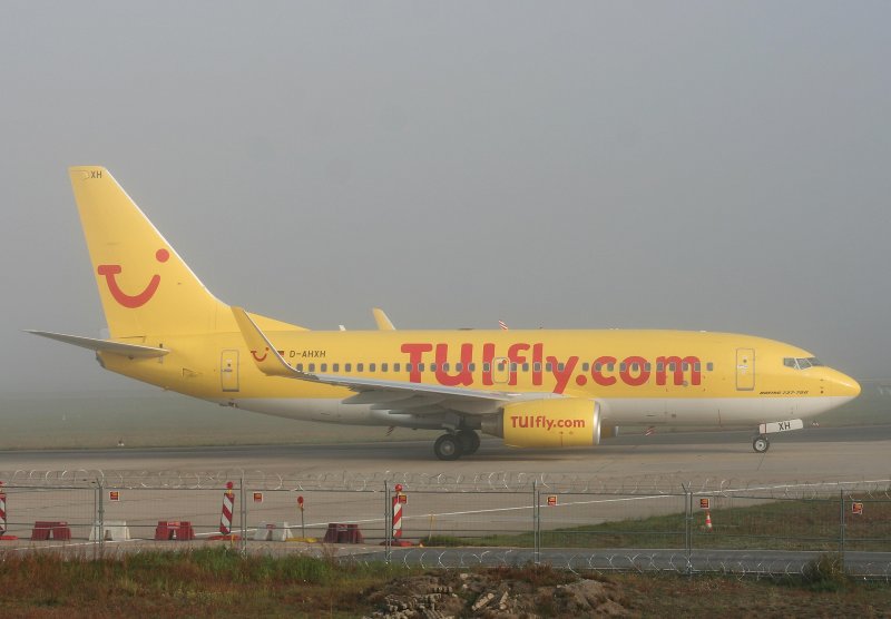 Tuifly B 737-7K5 D-AHXG im morgentlichen Nebel am 27.09.2008 auf dem Flughafen Berlin-Tegel