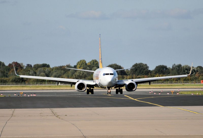 Frontbild einer Boeing 737-800 der Pegasus Airlines beim abrollen von der Landebahn in Düsseldorf - 09.10.2009