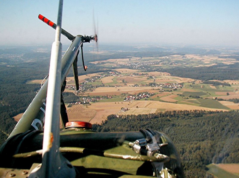 Kein alltäglicher Ausblick vom Hubschrauber (Hughes 269 C). Aufgenommen im Sommer 2002.