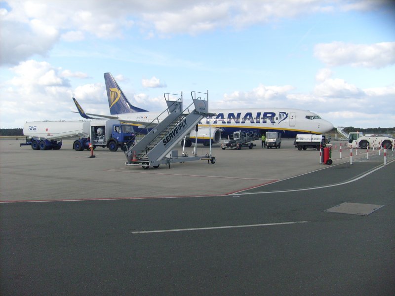 Ryanair Boeing 737-800 (EI-EBK) kurz vor der Abfertigung am Flughafen Niederrhein.(18.10.09)