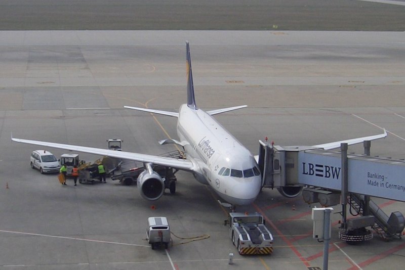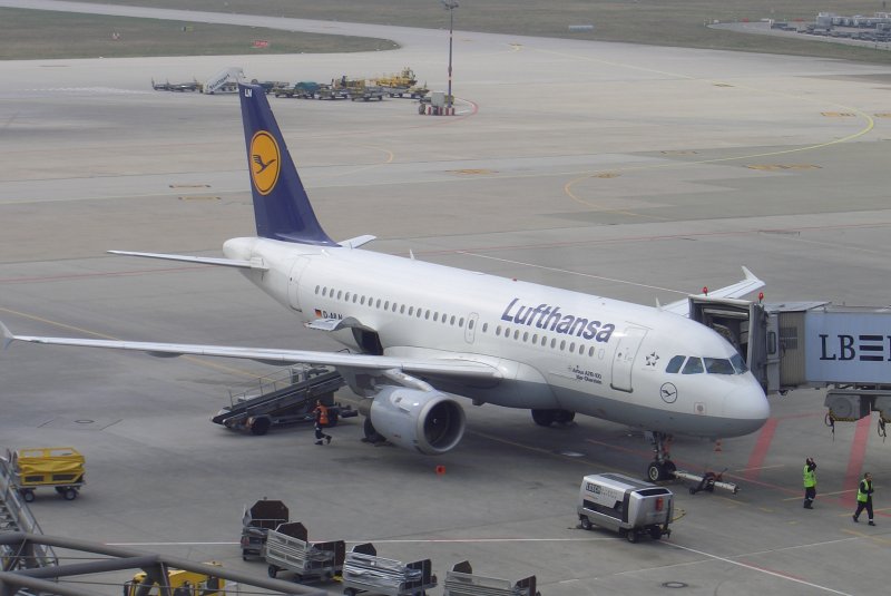 Airbus A319-100 der Lufthansa am Terminal des Stuttgarter Flughafens, vor dem Push-back
