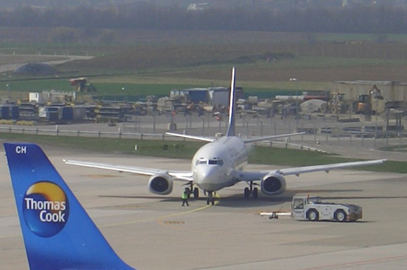 Diese Boeing 737-700 der TUIfly wird nach der Landung in Stuttgart gerade zu ihrer entgültigen Parkposition zugewiesen