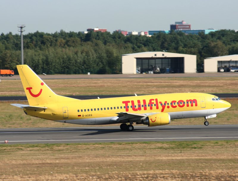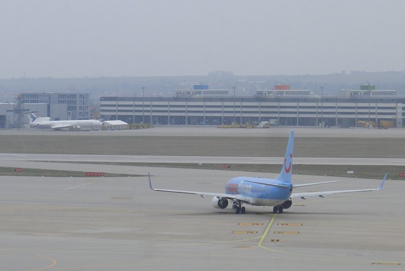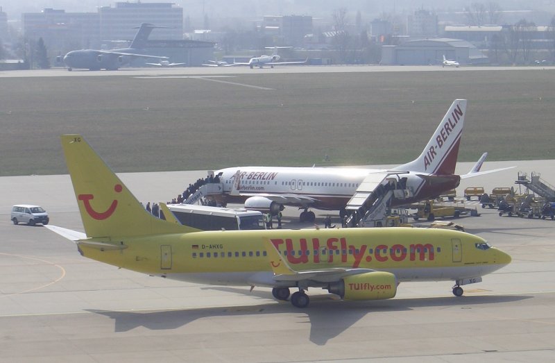 Eine TUIfly-Boeing 737-700 mit der Kennung D-AHXG rollt nach der Landung in Stuttgart zu ihrer entgültigen Parkposition