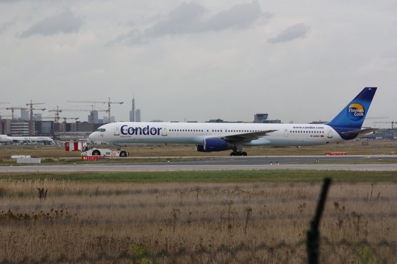 Boeing 757-300, Kennung D-ABOI von CONDOR wird am 05.09.2009 von der LUFTHANSA Wartungshalle kommend, über die Rollbahn zum Abstellplatz gezogen. Frankfurt/Main Flughafen.