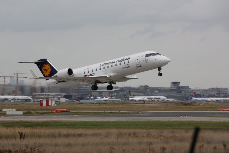 Bombardier CRJ200, Kennung D-ACLY von LUFTHANSA REGIONAL startet am 02.09.2009 auf Startbahn/West von Frankfurt/Main Flughafen.