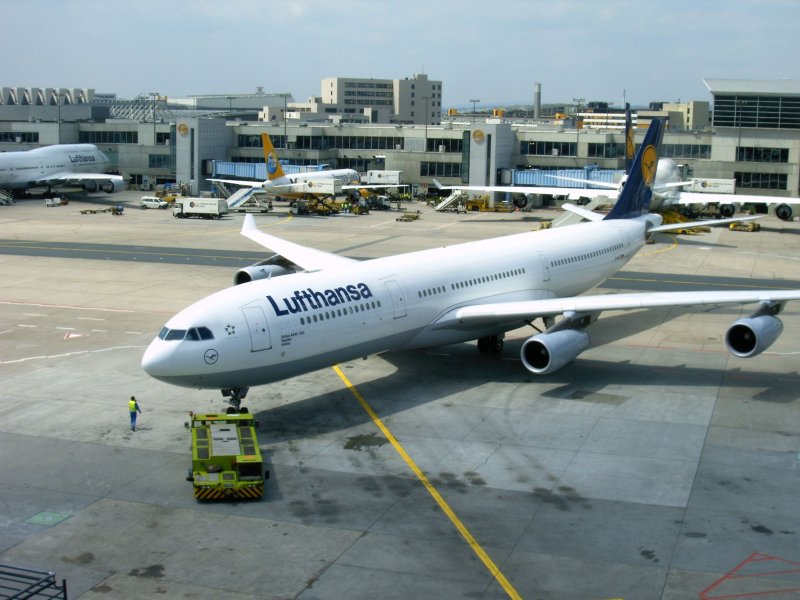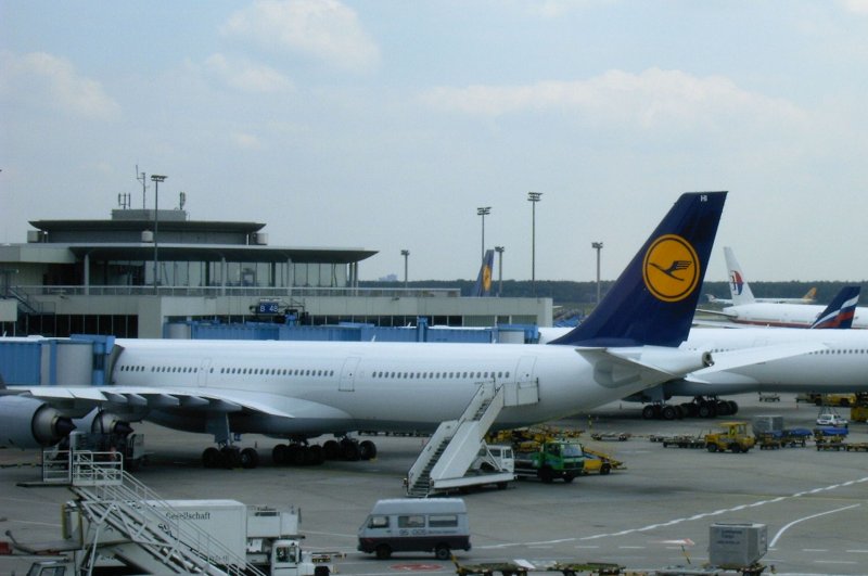 Lufthansa-Airbus A340-600 mit der Zulassung D-AIHI am Terminal in Frankfurt am Main