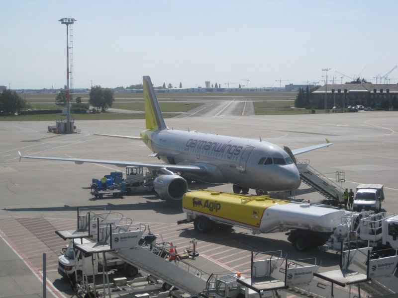 Ein Airbus A319 von Germanwings mit der Kennung D-AKNT nach der Landung auf dem Flughafen Berlin-Schönefeld