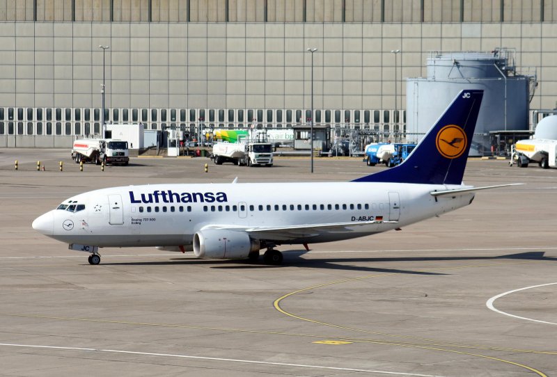 Eine Lufthansa-Boeing 737-500 mit dem Taufnamen "Erding" und der Zulassung D-ABJC auf dem Weg zur Runway 08R des Berliner Flughafen Tegel