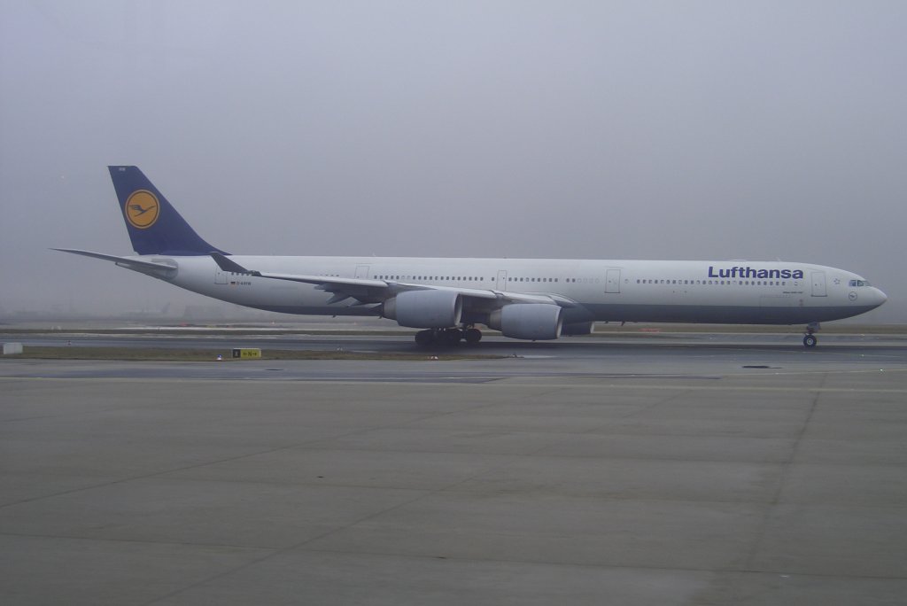 Dieser Airbus A340-600 der Lufthansa befindet sich unmittelbar vor dem Start. Gleich bekommt er die Starterlaubnis und er hebt ab auf Runway 18 in Frankfurt am Main am Samstag, den 6. Februar 2010.